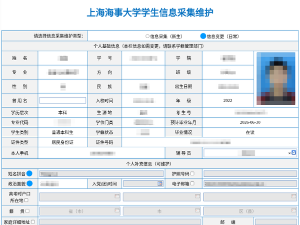 信息采集维护类型请勾选“信息变更(日常)”,请仔细核对个人基础信息模块中的各项信息,如在校期间更改了姓名,请联系学生处学籍管理科(联系电话:38284368);如专业方向有问题,请先与学院确认,由学院确认后集中反馈给教务处教务信息管理中心(联系电话:38284272)。